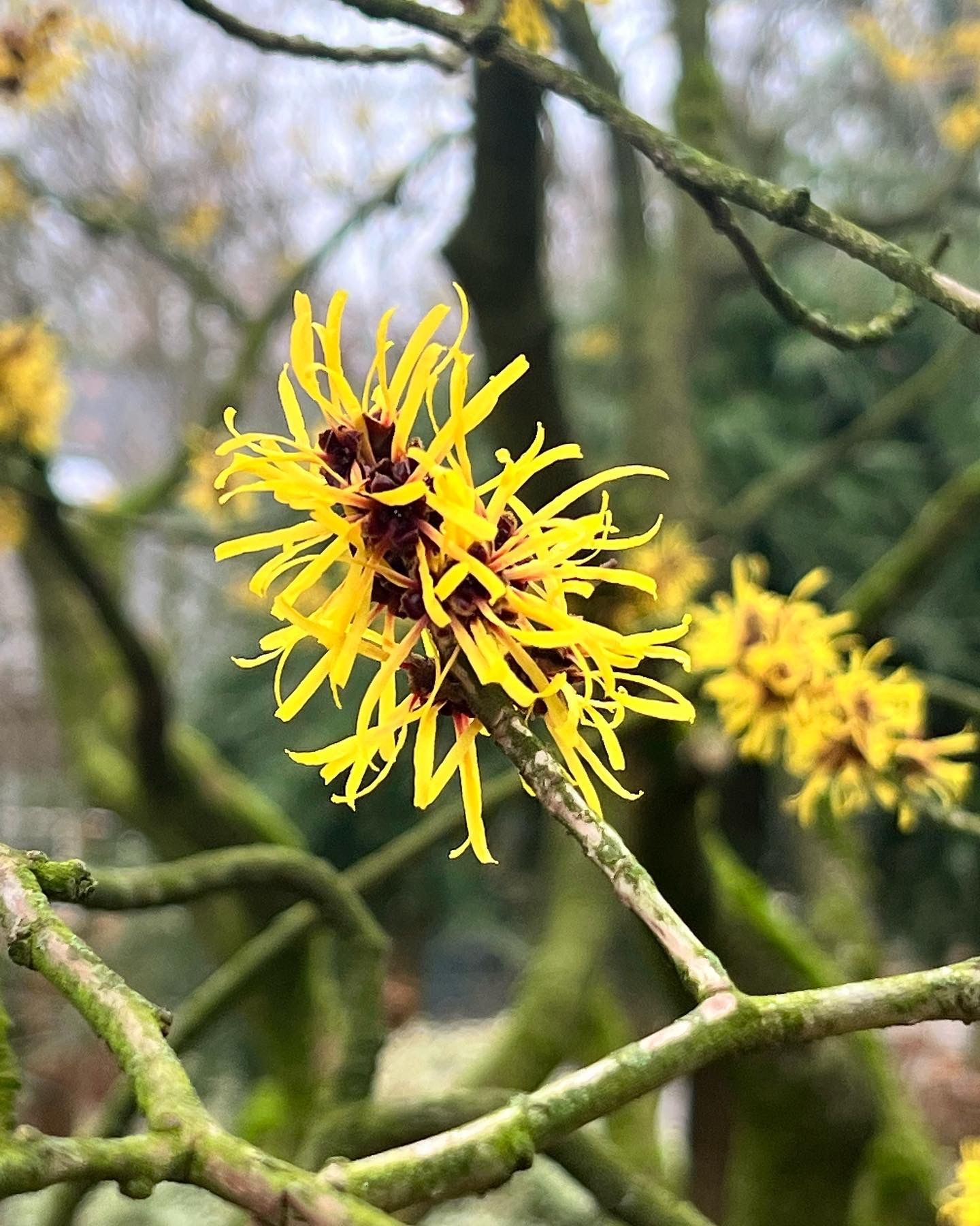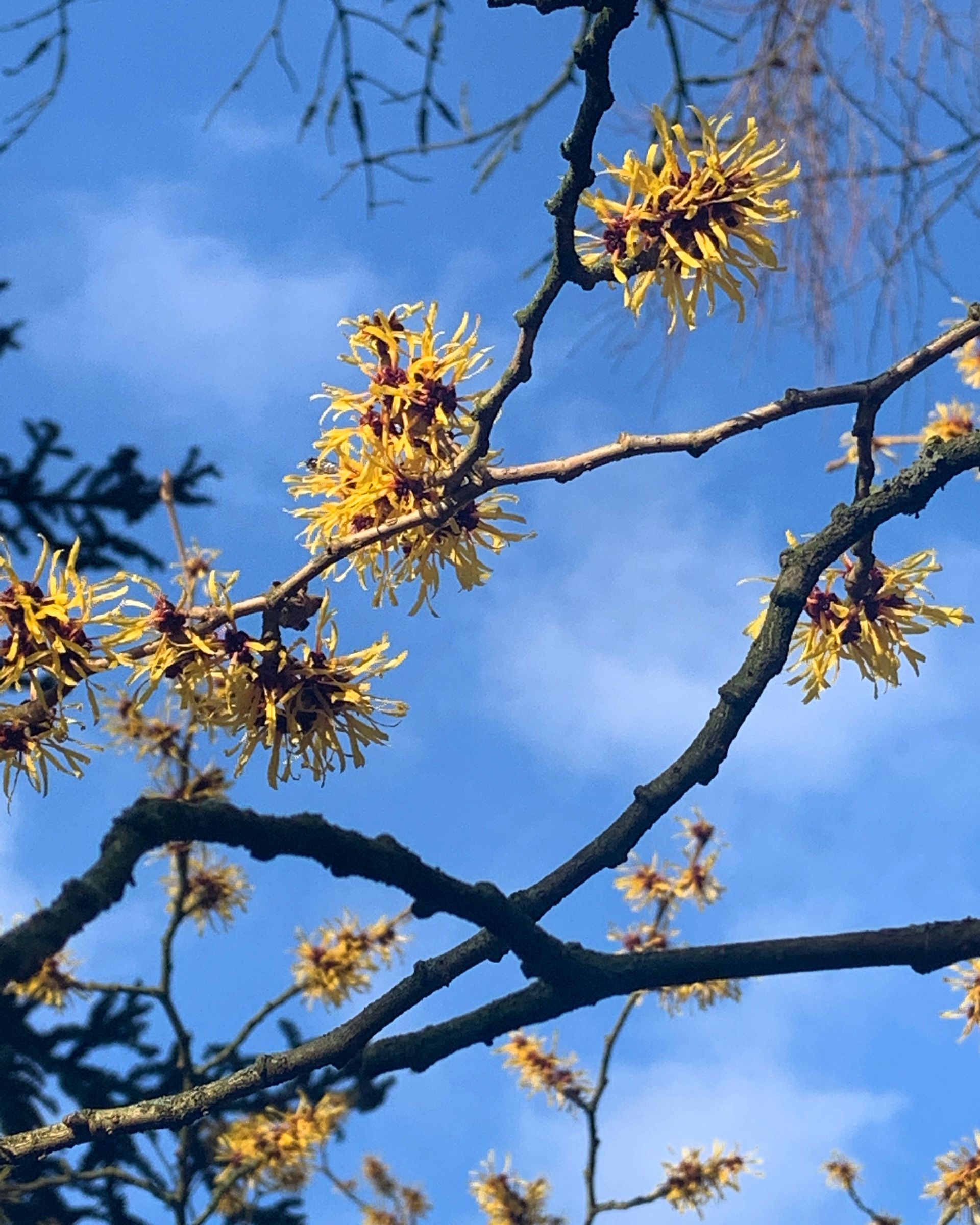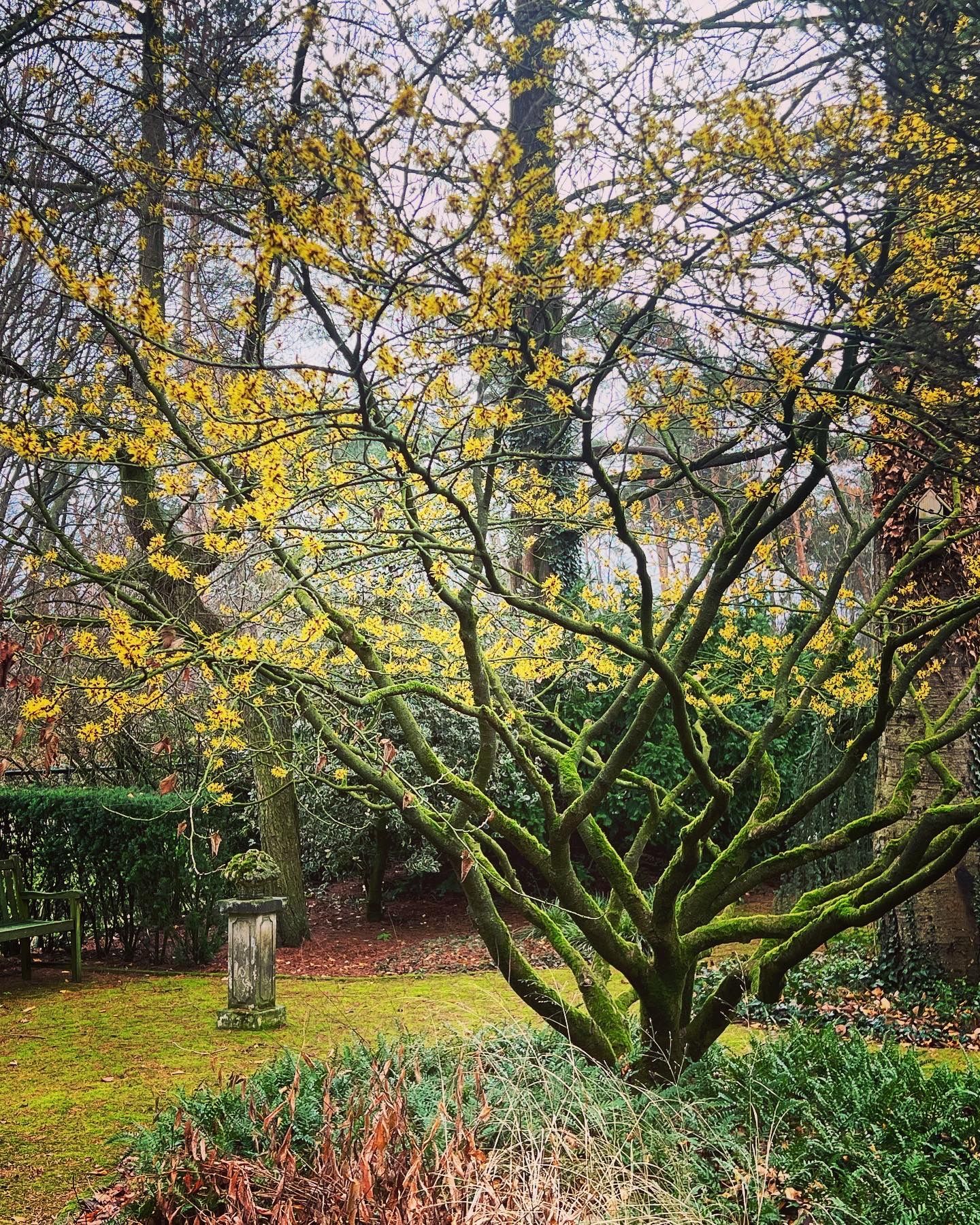 In onze tuin staat een Hamamelis mollis en naar verluid is dit de eerste aangeplante boom in onze tuin, zo’n 60-70 jaar geleden. Nu in deze tijd van het jaar (januari-maart) bloeit de toverhazelaar op kale takken met diepgele serpentine-achtige bloemen die heerlijk geuren. De meerstammige boom wordt zo’n 3-5 meter hoog en is zeer winterhard. De toverhazelaar doet het prima op vrijwel iedere grond en houdt van een beetje kalk in het voorjaar.
